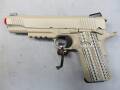 2000年初頭、アメリカ海兵隊はMEUピストルに代わる新型ハンドガンを制式採用しました。それが、コルト社が手がけた「M45A1 CQBピストル」。各部には命中精度を追求するカスタムガンなみの加工を施し、新たにレイル一体型フレームやG10素材の特徴的な積層グリップ、スライドには間隔が広いセレーションを採用。また、大部分の外装をタンカラーで仕上げるなど、MEUピストルの後継としてふさわしいモデル。ガスブローバック「M45A1 CQBピストル」では、特徴的な外観や質感の再現性にこだわりながら、内部メカのアップグレードも実施。従来のガスブローバック・ガバメントモデルに比べ、リコイルショックの強化や作動の安定性向上を実現。